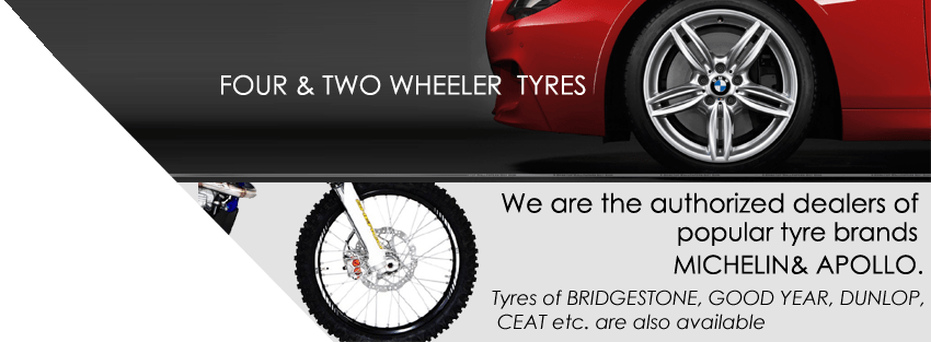 Tyres for both 4 wheelers and 2 wheelers are available here. We are now dealers of Michelin, Apollo, Goodyear tyres. |